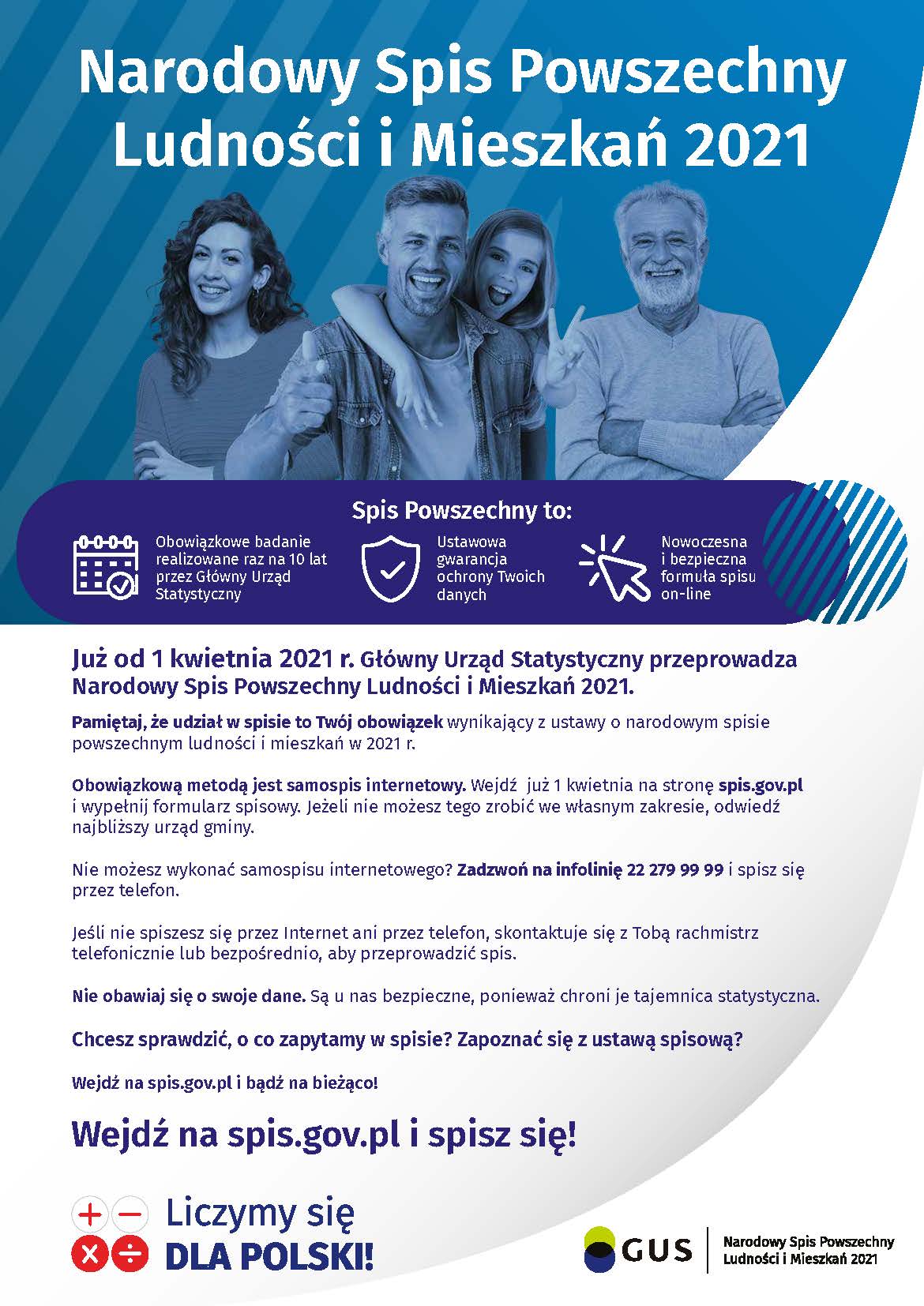 Do pobrania poniżej artykuł reklamowy i ulotka informacyjna nt. realizowanego Narodowego Spisu Powszechnego Ludności i Mieszkań 2021.